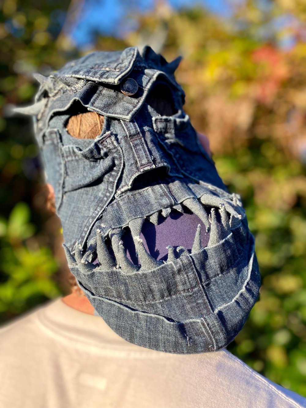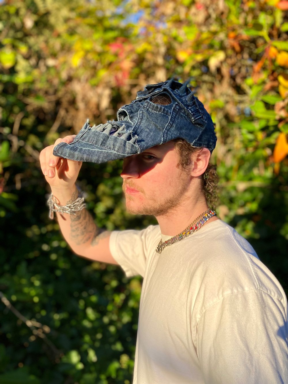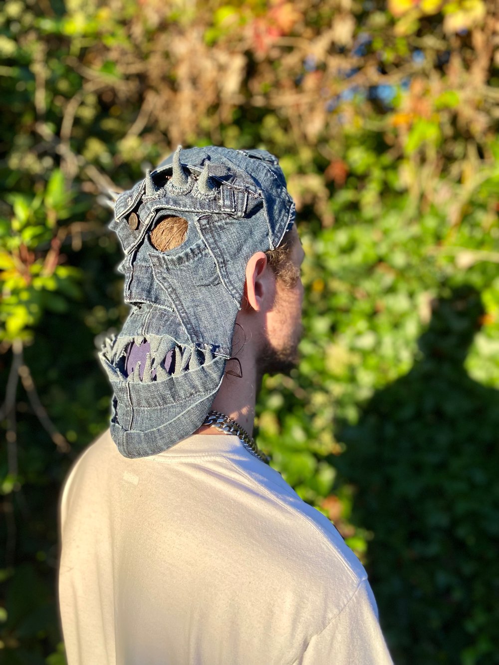 1 of 1 denim crafted hat/mask made with a fisherman's cap, utilizing the long bill to construct this beast