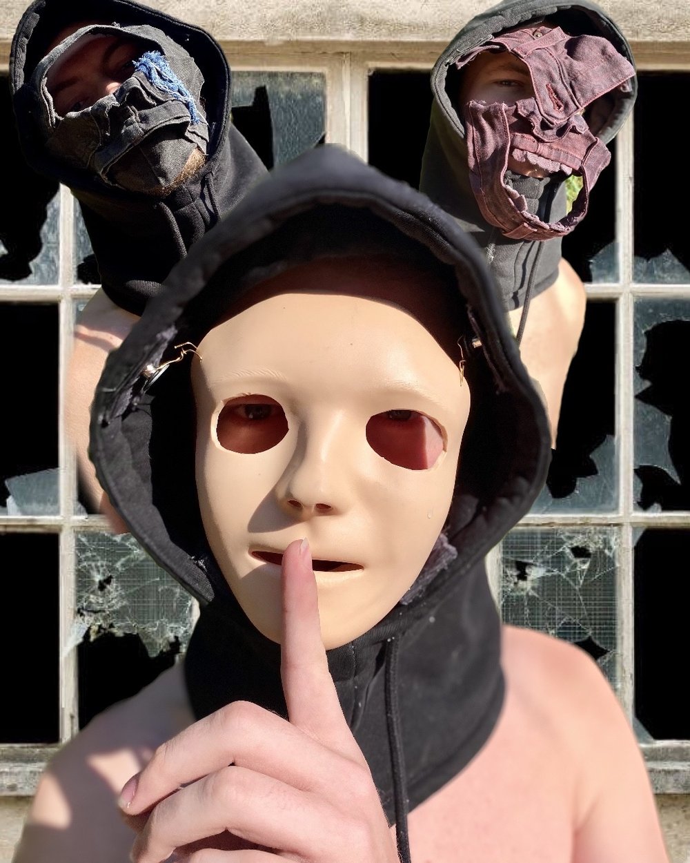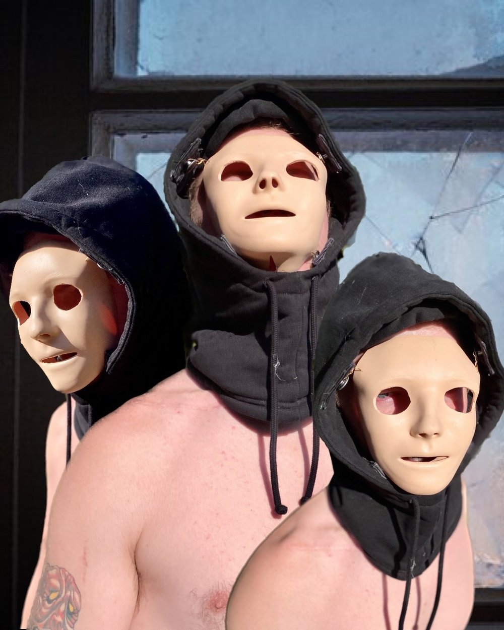 WE ALL PUT ON A FACE TO HIDE OUR TRUE EMOTIONS AT SOME POINT, SADDNESS AND RAGE… OR JUST A FACE OF ACTING HUMAN… all given the opportunity with this hood, detachable faces ready to be swapped.