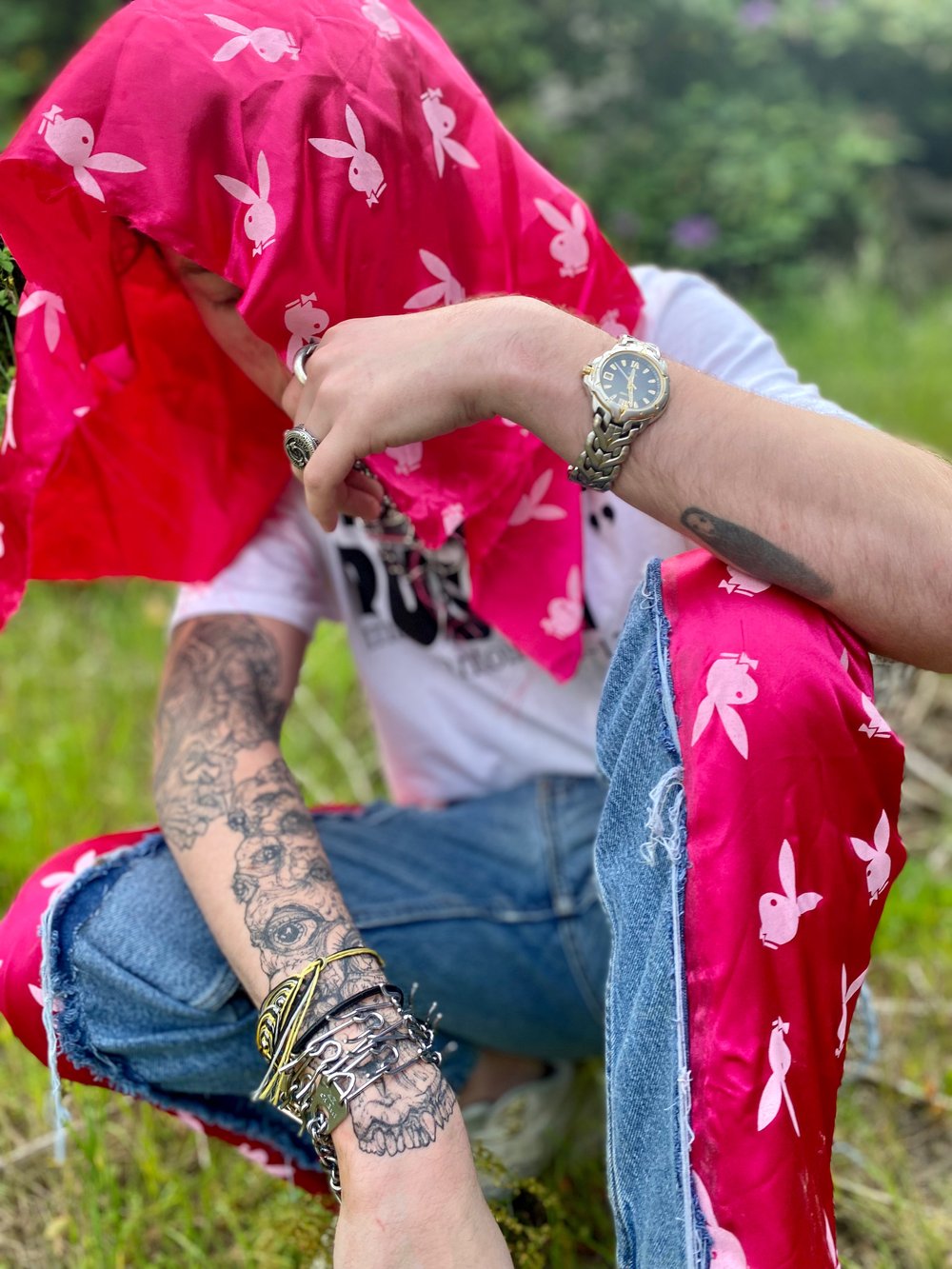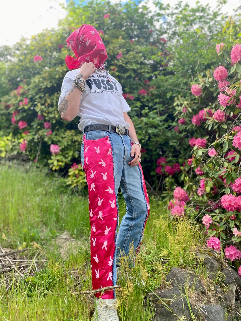 PLAYBOY BUNNY BED SHEETS RECYCLED INTO JEANS, CUSTOM MAKING YOUR ORDER TO YOUR SIZE - JUST LET ME KNOW YOUR WAIST AND LENGTH SIZE AND GIVE ME 2 WEEKS TO CRAFT <3
