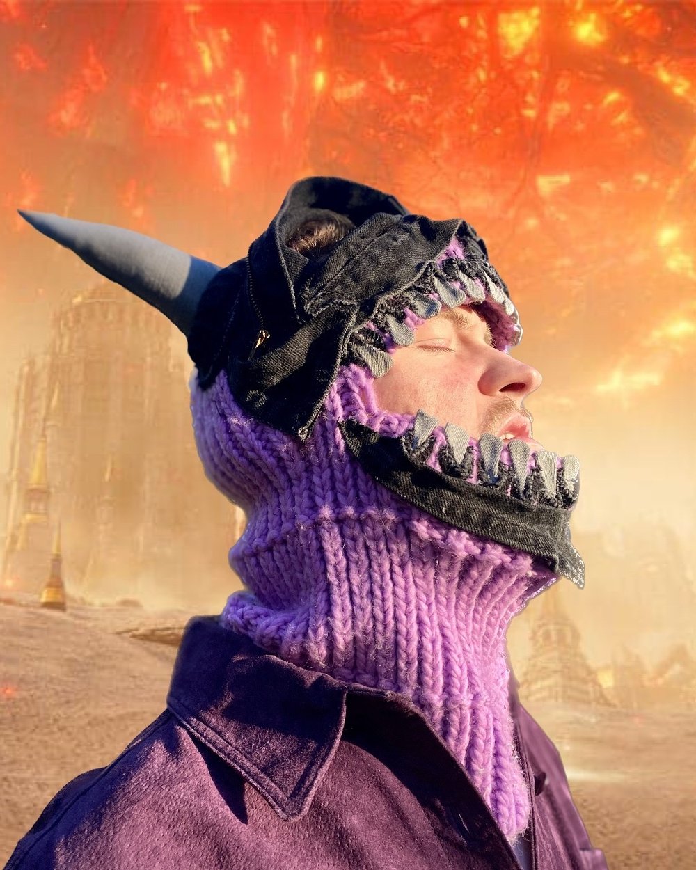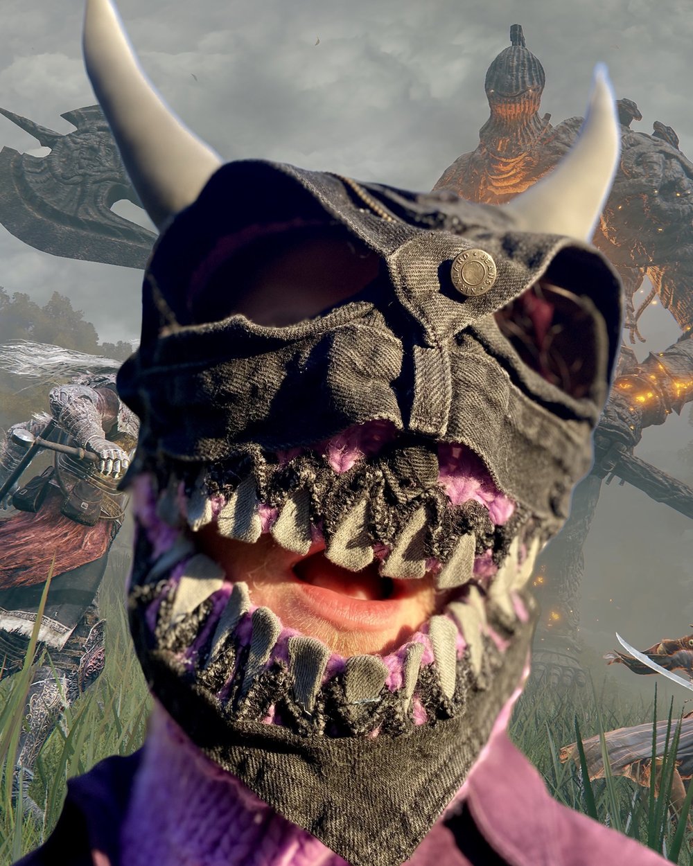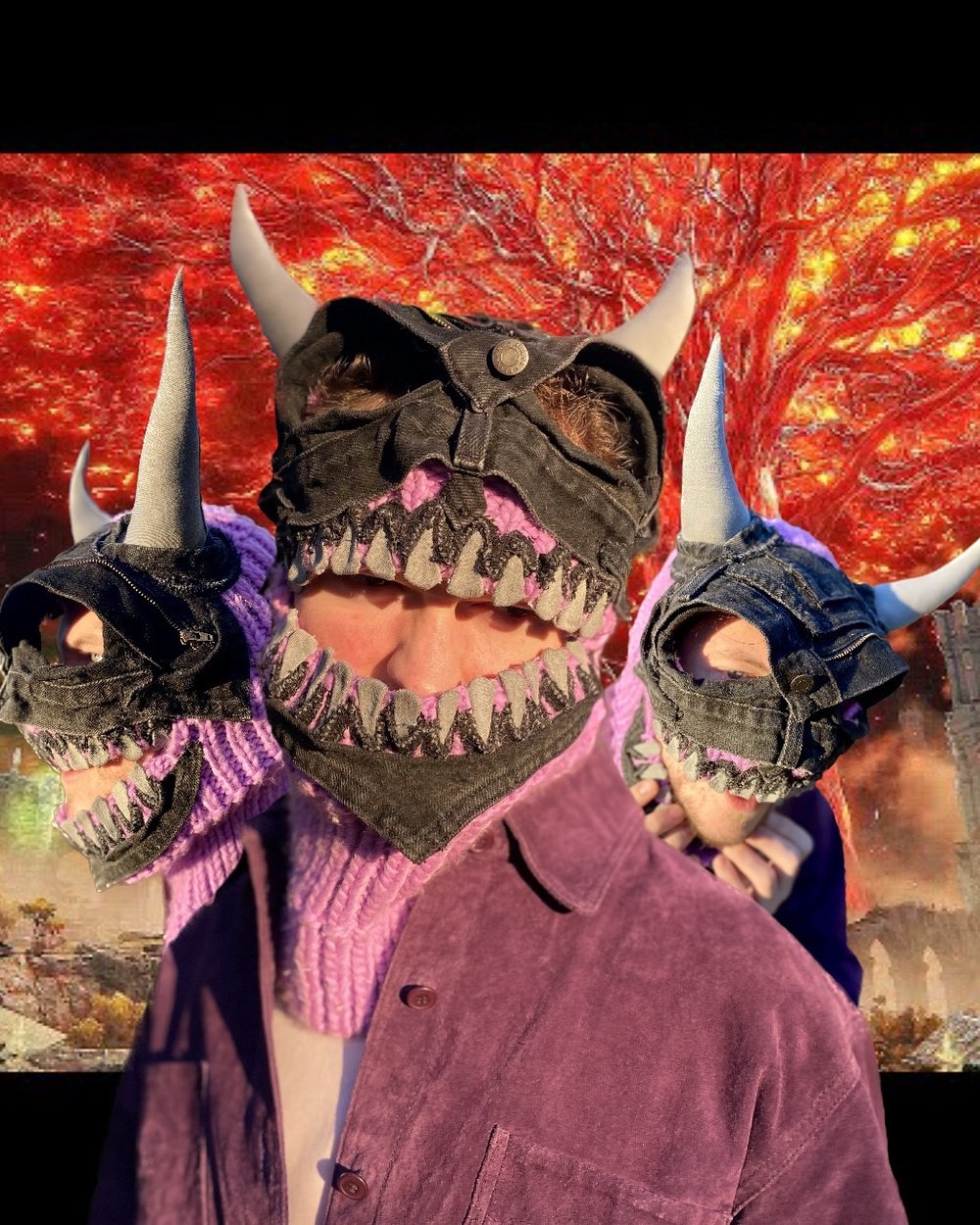 1 of 1 ski mask, in the style of monster armor, can wear in multiple ways, whether face through the mouth or pull it down and look through the eye holes